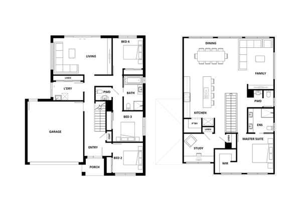 Step inside the spacious Acacia 261 RL and you will be impressed by what it has to offer. The ground floor features three of four bedrooms, all with built-in-robes, as well as the laundry, family bathroom and generous living area, an ideal kids’ hangout. Take the stairs up to the first floor and you will be welcomed into the open-plan entertaining area, complete with a large kitchen, plus an island bench and walk-in-pantry, dining area and family room. Everyday living is easy with a centrally located powder room and study. The space also houses the oversized master suite which features an ensuite with his and hers basins, and a walk-in-robe. With so many family friendly features, it’s easy to see why the Acacia 261RL is the perfect home.