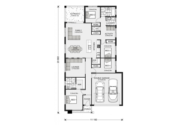 NOTE: Package price is based on a standard floor plan and standard facade (actual facade may be smaller than facade shown). Package may be subject to developer’s design review panel, council final approval and G.J. Gardner Homes procedure of purchase. Package price excludes stamp duty on land, legal fees and conveyancing costs (including transfer of title and searches). Prices are inclusive of GST and may changed without notice. The land is being sold in conjunction with the developer and G.J Gardner Homes makes no guarantee the lot number advertised will be available at the time of purchase. This design and illustration remains the property of G.J Gardner Homes and may not be reproduced in whole or in part without written consent. For detailed home pricing, please talk to a New Homes Consultant.