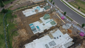 At the sales office, Hotondo have installed frames on the lower floor and structural steel supports for the upper levels. Next month they intend to install the upper floor slab and frames weather permitting.